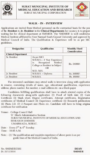 SMIMER Recruitment 2014 For Sr. Resident & Jr. Resident
